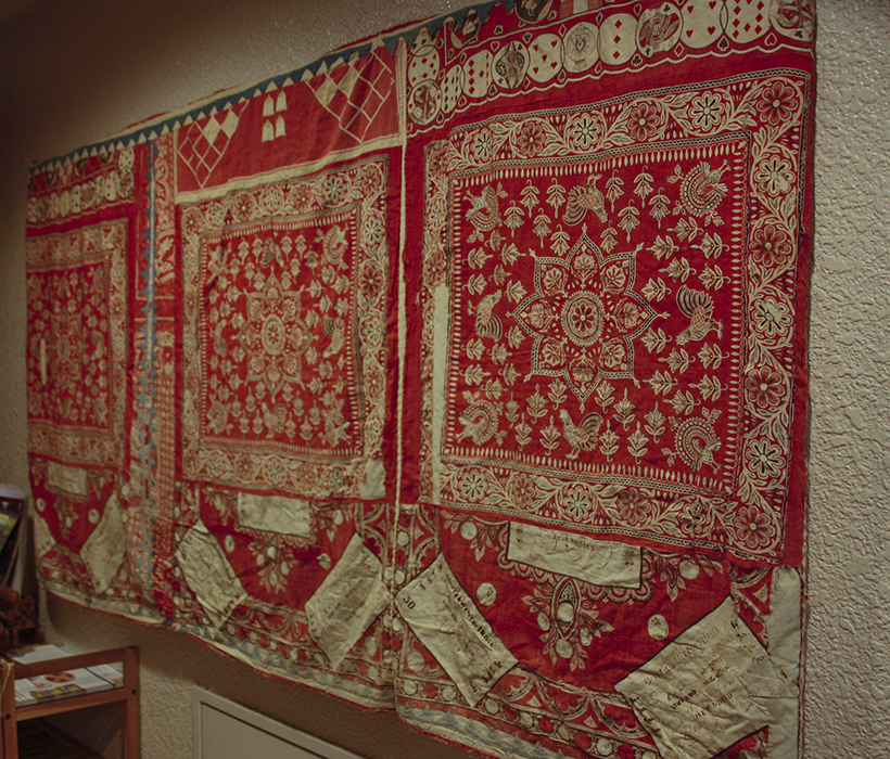 インドは染織の歴史の古い国ですが、ヒンドゥー教の教えで、縫製されない布は神聖な布とされていました。木綿を育糸に紡ぎ、色を染めて布に織る作業は、労のいる作業で、布そのものが大変貴重なものでありましたが、布に鋏を入れる行為は大切な布の生命を断つ事にも繋がると云う考えからではないかと思います。