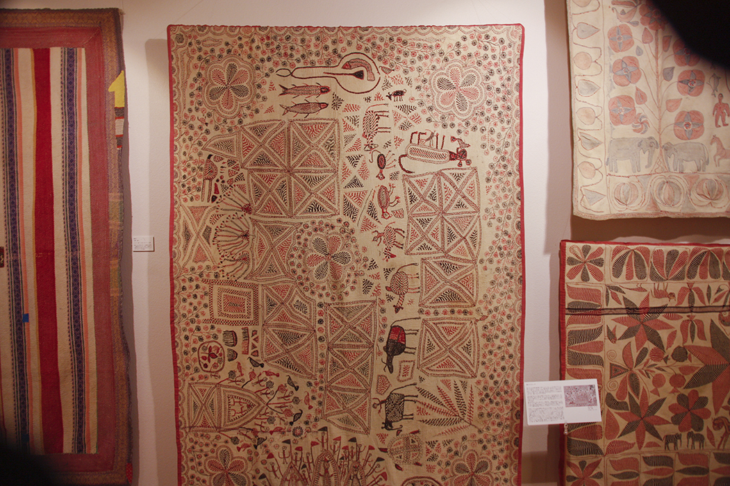 この度お見せするベンガル地方の白地のカンタは私が最初に出会った時、衝撃を受けた刺子です。清楚な白の使い古しのサリーを重ねて豊かな田園の生活を綴った楽しい刺子はベンガルの女性の心の布です。私がやっとその現場をバングラデシュの農村に探しあてた時、昔の様な個性にあふれた刺子は見つかりませんでしたが女性達は家計を助けたり、自立を目ざして屈託なく針をすすめていました。わずかに90才代の女性(出会った時は80代)が最後の世代らしく良い仕事を得意げに見せてくれました。