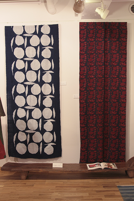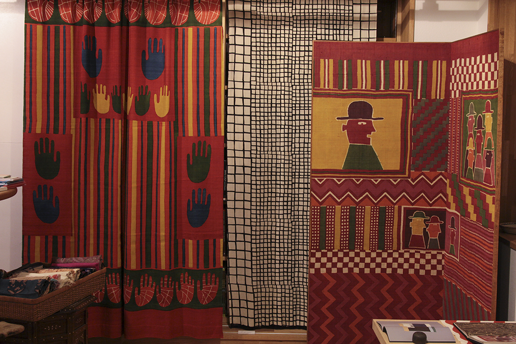 戦後の混乱期、故郷の岡山で民芸に出合い、芹沢けい介師の和紙のカレンダーの美しさに目を奪われ門をたたき、師の勧めでいきなり、浜松の紺屋に住み込みで型染の実際を習得したそうです。その後、女子美術大学の工芸科で教職につき乍ら、用の美を目指し、新しい型染を国画会や個展で発表し、その活動は版画やガラス絵、絵本の挿絵にも広がっています。私が学生の頃は、日本民藝館で沖縄の紅型を型染のお手本として見せて頂き、その後は下町で手拭いや浴衣を染める注染の工場を見学し、実際その時使っていた注染染めの機械が学校にも導入されました。先生も私達も初めてで、4mの布を用意し、型紙を張った木枠を布にのせ屏風畳みにしながら糊付けをし、上から染料を注ぎ、下の箱の空気をコンプレッサーで一気に抜いて染料を下まで通す仕組みです。布を広げると折った所の文様が対照になって出て来て、思わぬ形に歓声を上げたのですが、同時にコンプレッサーがうまく作動しない時はムラになる事もあり、ハラハラドキドキでした。失敗した布は絞りを加えたり、型を置いたり工夫をするとかえって面白くなったり、楽しい経験でした。その様な中で先生は、着実に今迄の型染の伝統を新しい大胆な発想で、独自の世界を築かれました。簡潔でバランス良く、美しい色彩は天性のものかも知れません。そして、どこかにユーモアを忘れず、型なのに柔らかく温かいものが根底を流れています。作品は個展の折々に少しずつ譲って頂き、最初は大切にしまっておいたの