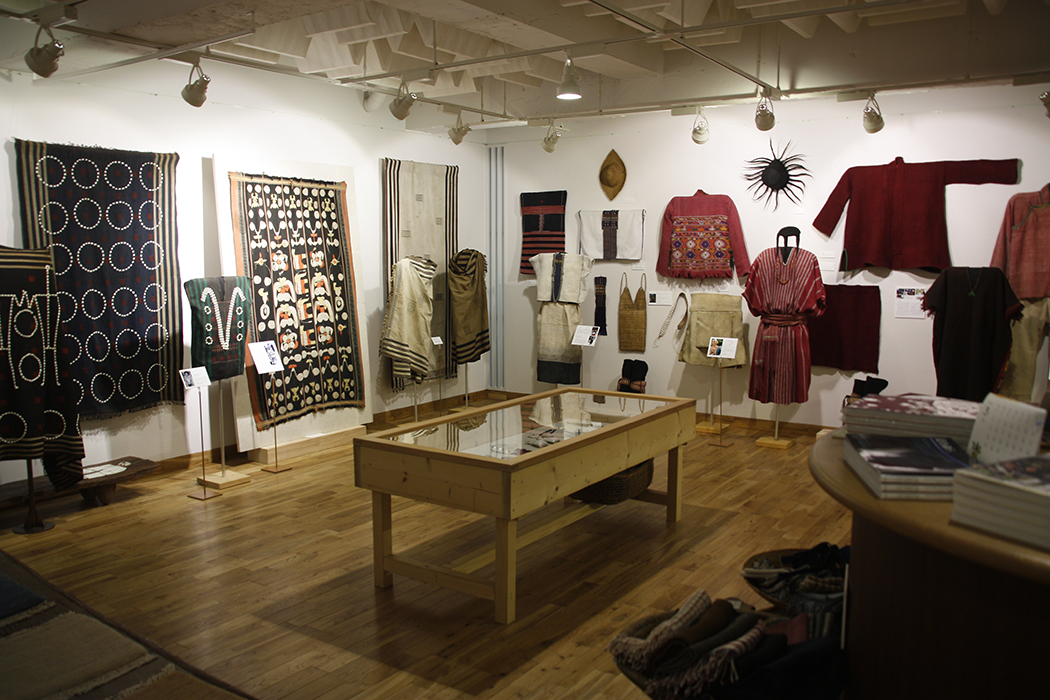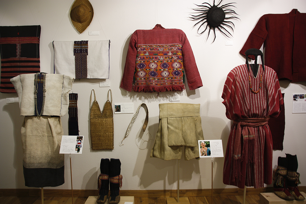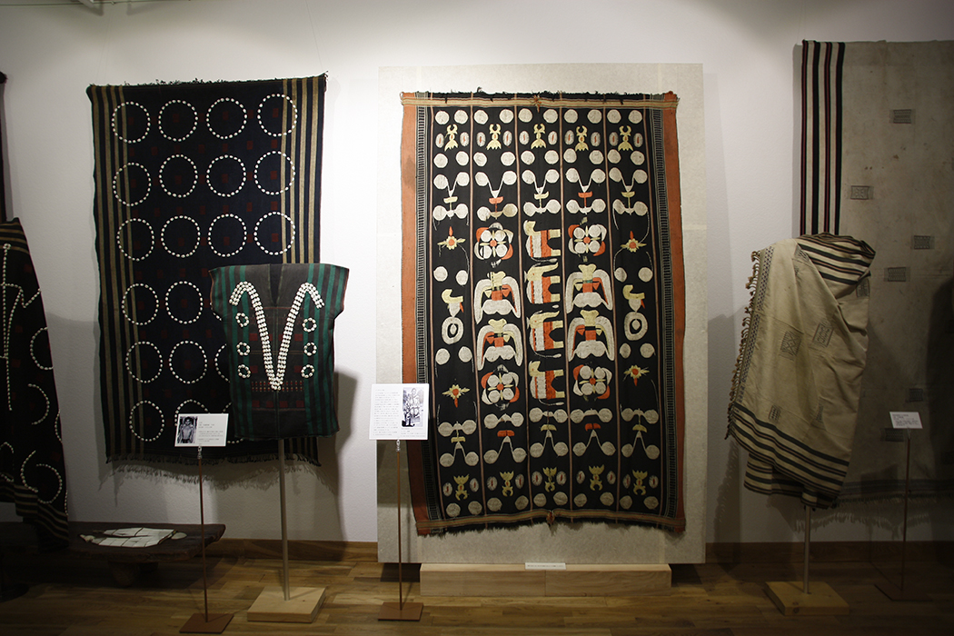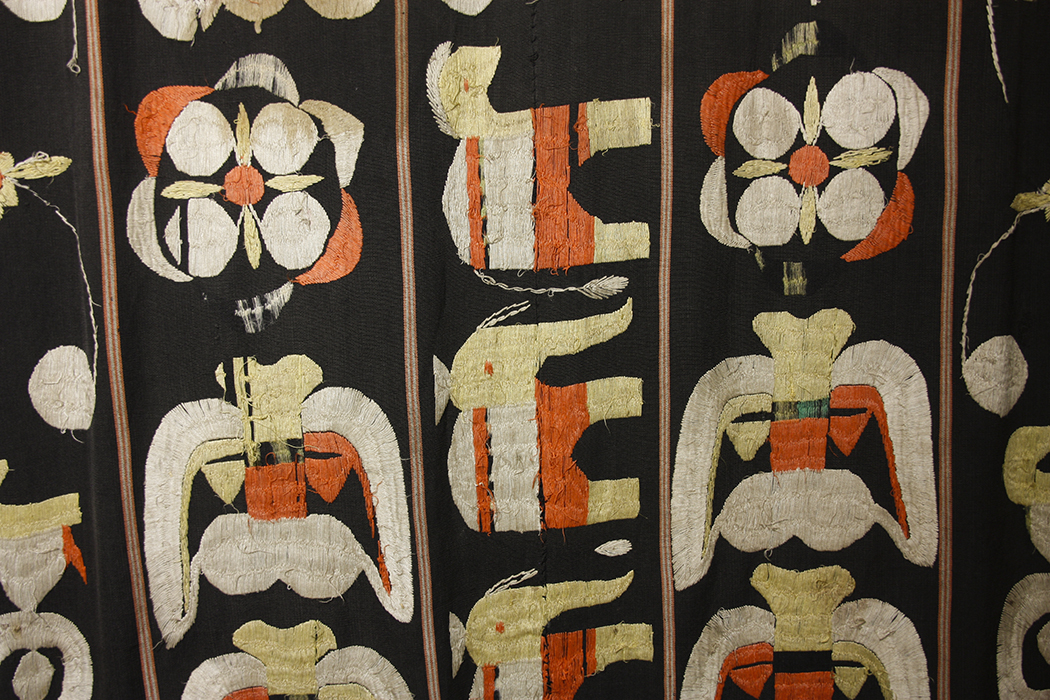 ナガランドの人々は聞くところに寄ると、インド洋を渡ってミャンマーに着き、更に北上し、現在の海抜2000mを越す高地で自給自足に近い暮らしをしていましたが、織物や装身具作り、見事な住居作りに卓越していました。現在でも奥地は電気すらないところもあるようです。表紙のエレファント文様の肩掛けは、低地に住むナガの人たちのもので、手織り地に象や蝶、抽象文を刺繍した肩掛けです。造形力の素晴らしさに驚きました。
