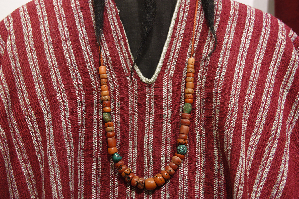 ナガランドは第二次世界大戦後、独立国家を目指していましたがそれは果たせず、1963年にインド領になりました。その後長い間、旅行者の入国は閉ざされていました。アルナーチャルも中国の侵入問題があり、同様でした。デリーの骨董屋の店先で初めて見た、黒地に子安貝を使って円文を描いた大胆なナガ族のショールは首狩りをした者のみに纏えるショールで織も緻密で、カラフルなビーズ、真鍮、貝、めのうを使ったユニークなネックレスなど、この異色の服飾品は、代々受け継がれ使われてきたもので、本物を目にして驚き、ナガランドへの憧れは増す一方でした。