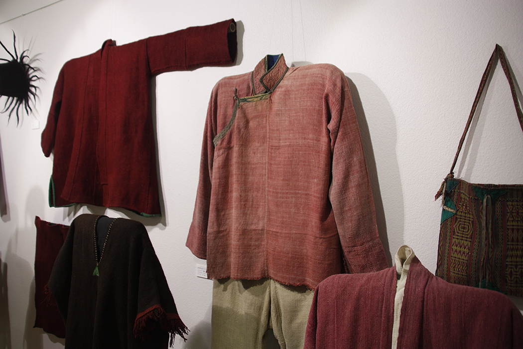 一方、アルナーチャルの仏教徒、モンパの人々は野蚕のエリシルクをラック(カイガラムシ)で燕脂に染め、色糸で文様を縫い取った上衣をデリーの店で見かけ、次に東ブータンの路上でたまたま出合った遊牧民、ダクパの人々も同じものを着ていました。更に同じ服装の人々がアルナーチャルにも居ることを知り、今回の講師でもあるモンパの研究者の脇田氏に同行させてもらい、モンパの服装の全貌を見ることができました。