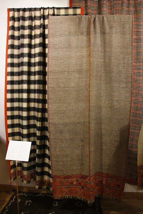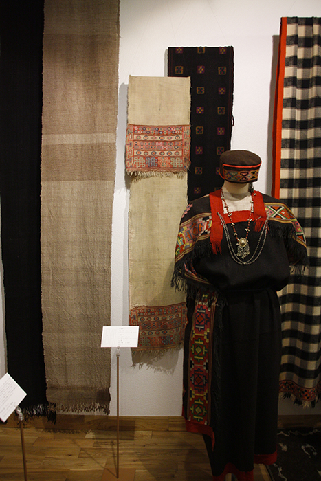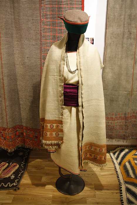 この巻衣装は自家産の羊毛を紡いで織った、パトゥと呼ばれる巻衣装で(巾1.2mで長さは4m)、身体に巻き付けて布端を両肩に後ろから持ち上げて、ピンでとめ、腰ひもを帯のように巻いて着用します。