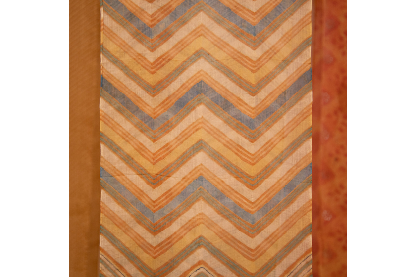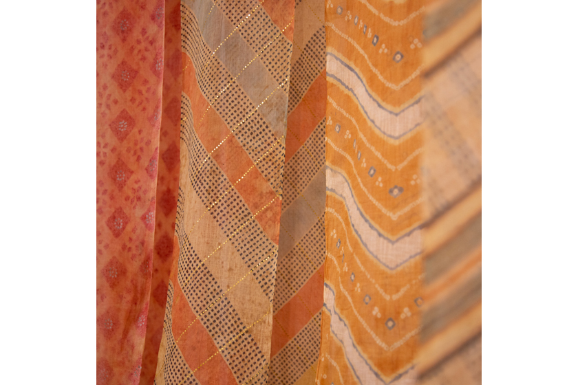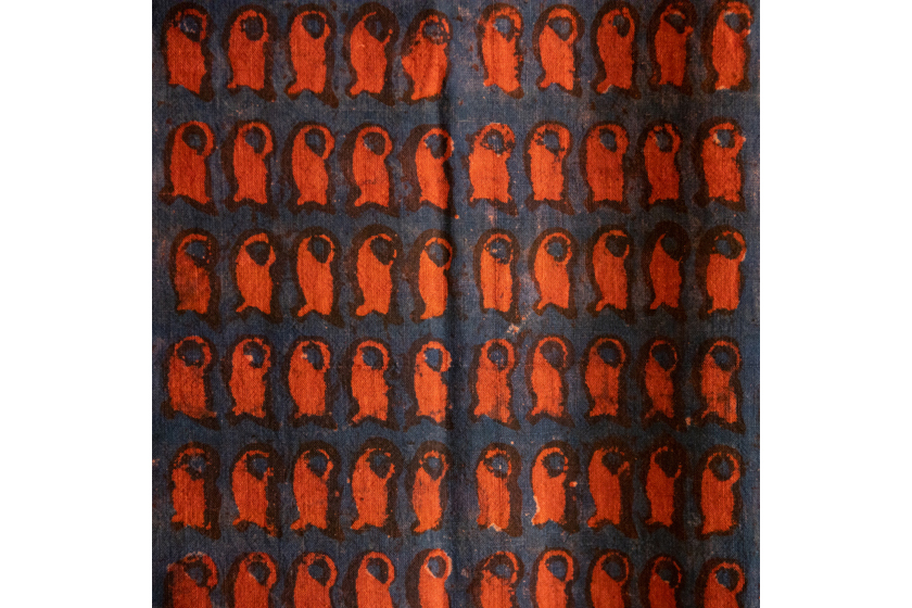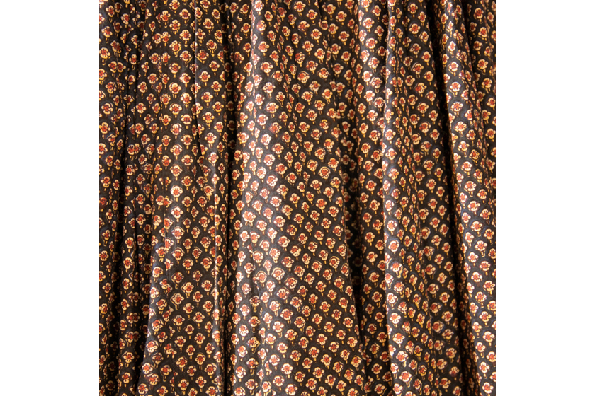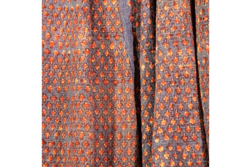 後期は、隣接するラージャスターン州の染織品を展示。州都であるジャイプル近郊には400年の伝統を持つ木版更紗の産地があり、村の暮らしに寄り添うように女性のスカート、被衣、袋、床敷き、壁掛けなどあらゆるものが使われてきました。また、布端から対角線に巻き、糸で括って染めることを繰り返す「ラハリア」や、日本の鹿の子絞りと似た「バンダニ」と呼ばれるインド特有の絞り技法が施されたターバンや被衣も併せて紹介します。