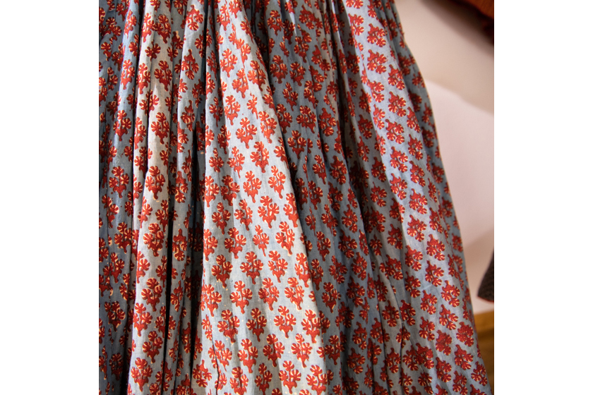 インド通いがはじまったころ、グジャラート州カッチ地方の伝統的なアジュラック染の職人、モハマッド氏の案内で私はある村を目指していた。その途中、8台の牛車が陽気な歌声と共に近づいてきた。近くに寄って話を聞くと、移動するラージプートの一団だった。女性のはいている木版更紗のスカートが美しく、どこで手に入れたか尋ねたら、近くの店にあるという。
