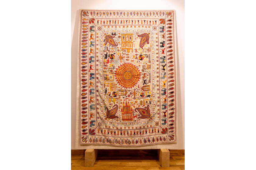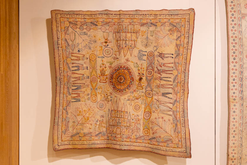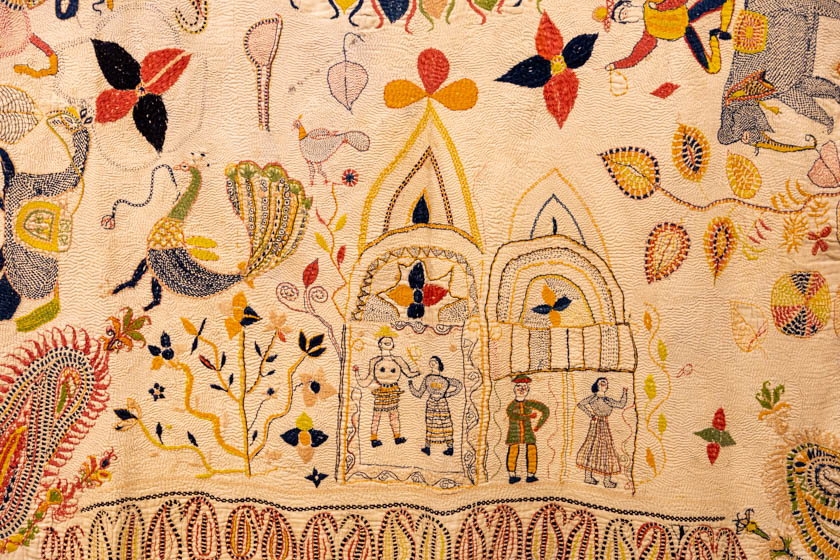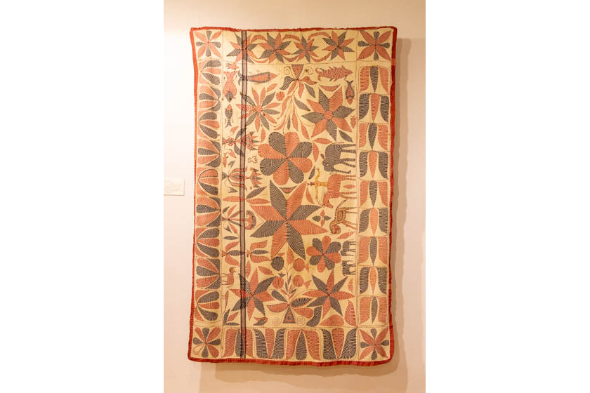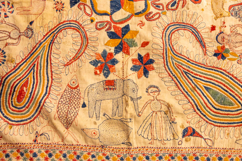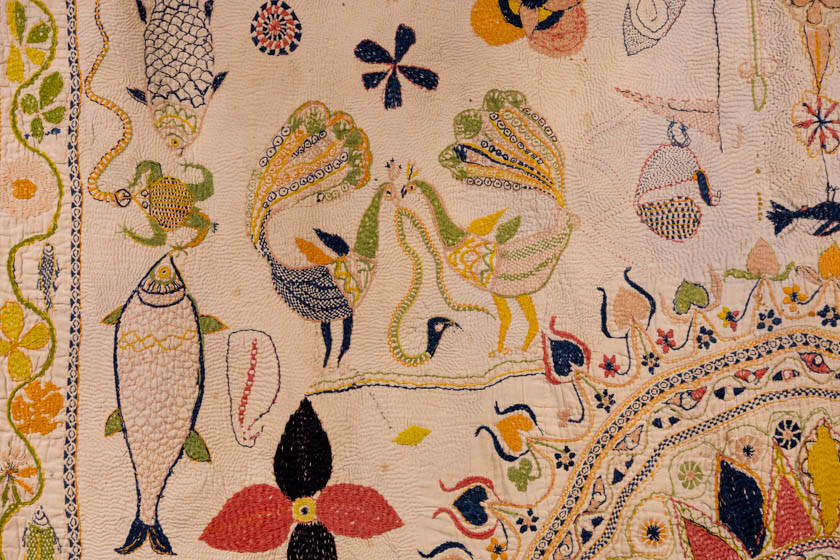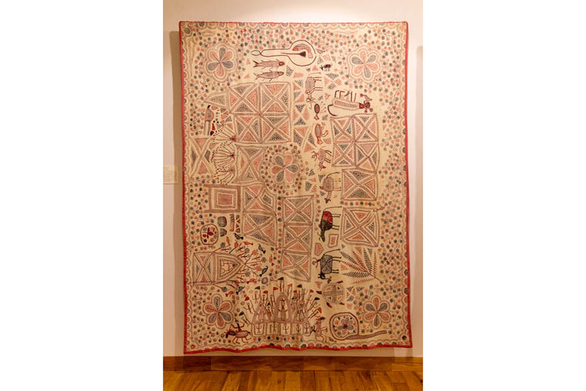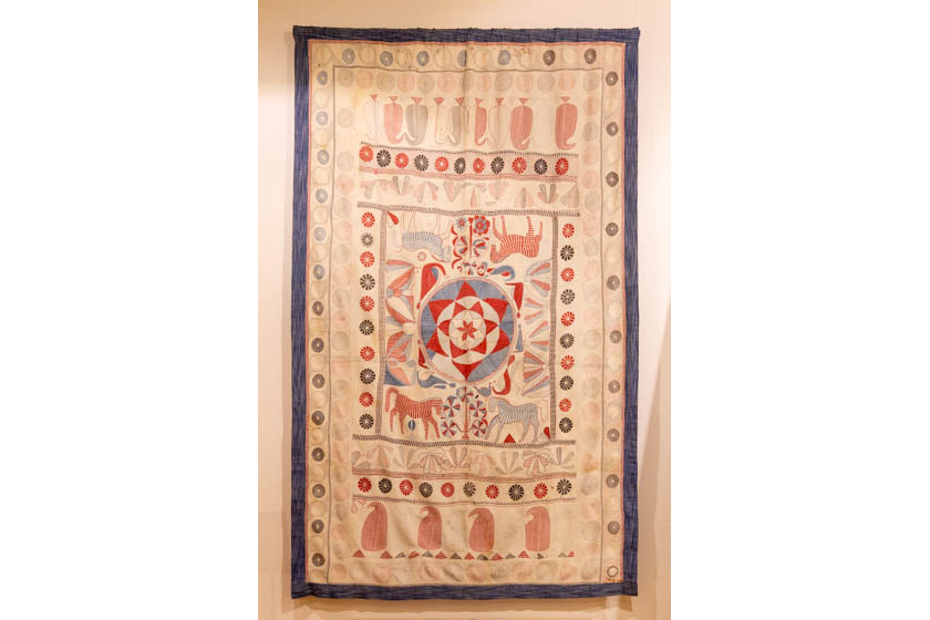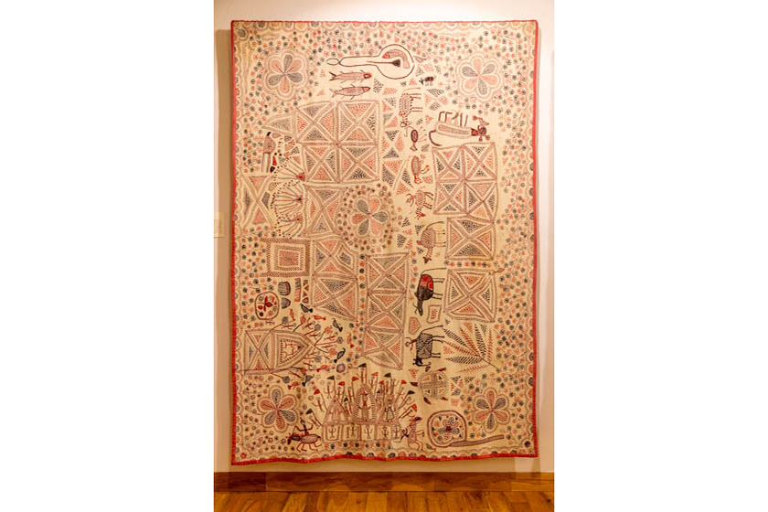 かつてのベンガル州で作られたカンタは、使い古しの白木綿を4、5枚重ね、農作業や日常の暮しの合間にコツコツと刺されて仕上がった廃物利用のキルトです。しかし糸でつづられた物語の様なデザインの楽しさはだれにも眞似が出来ない純な思いが伝わってきます。カンタを見て心動かされない人はめったに居ないでしょう。使い終った白木綿が更に輝きを増すやさしさに包まれ、布仕事の無限の樂しみです。只のボロ布が母の手で清められ再びよみがえった布です。特別な一瞬です。是非見て頂きたい一点ものの作品です。